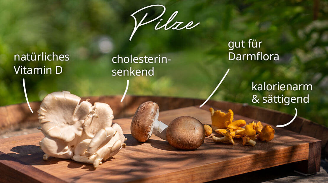 Pilze sind kalorienarm, ballaststoffreich und liefern wertvolle Mineralstoffe. Einige Sorten enthalten sogar Vitamin D – eine echte Seltenheit im Pflanzenreich.